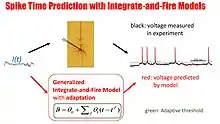Le modèle de neurone d'intégration-et-tir avec fuite prend en compte les fuites du neurone mais ne tient toujours pas compte de l'adaptation neuronale, de sorte qu'il ne peut pas décrire un train d'impulsions mesuré expérimentalement en réponse à un courant d'entrée constant[15]. Cet inconvénient est supprimé dans les modèles d'intégration-et-tir généralisés qui contiennent également une ou plusieurs variables d'adaptation et sont capables de prédire les temps des potentiels d'actions des neurones corticaux sous injection de courant avec un degré de précision élevé[16],[17],[18].