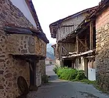 - Mogrovejo, un des villages les plus typiques de la comarque de Liébana, n'a que peu souffert des altérations du temps[5]. Les maisons populaires de Mongrovejo, qui servent à la fois d'habitations et de bâtisses agricoles, répondent à la typologie architecturale lebaniega (de la région de Liébana). Ce sont des maisons de pierre en petit appareil, dont une est décorée d'un balcon remarquable du XVIIIe siècle en ferronnerie et d'autres possèdent des encadrements de fenêtres en pierres de taille. Certains murs de maisons sont composés d'entrelacements de branchages renforcés avec du torchis de boue séchée. Certains entrelacements de branches de murs extérieurs restent sans torchis, formant ainsi une aération pour la pièce intérieure servant à stocker la paille. L'étage supérieur est parfois ouvert à l'extérieur avec l'accès au deuxième étage qui se fait par un escalier extérieur appelé patín (es) en espagnol, copié de la voisine architecture populaire asturienne. Les fours à pain sont habituels, dont la forme semi-circulaire déborde sur l'extérieur des édifices[7]. Ils sont parfois placés en hauteur et soutenus par un système de poutres posées au sol. Certaines maisons sont placées dans des parcelles encloses de hauts murs et munies d'entrées monumentales[7].