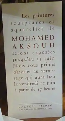 - 1983 : Paris, Aksouh, rétrospective en 50 tableaux, Centre culturel algérien, exposition inaugurale[2]