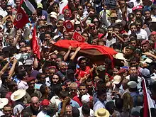 Le 27 juillet, Mohamed Brahmi est enterré dans le carré des martyrs du cimetière du Djellaz, près de la tombe de Chokri Belaïd, en présence de dizaines de milliers de personnes[15].