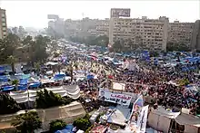 Un important mouvement protestataire éclate en . Le , en prévision des manifestations organisées pour le par le groupe Tamarrod, Morsi déclare lors d'une allocution que « l'affrontement politique actuel menaçait la démocratie et risquait de plonger l'Égypte dans le chaos »[28]. Un an après son arrivée à la présidence de la République, le , des millions d’Égyptiens manifestent pour sa démission (14 millions selon une source militaire citée par l'agence Reuters ; 17 millions selon les sources policières relayées par l'Agence France-Presse)[29]. Les manifestations continuent les jours qui suivent, des heurts entre manifestants font plusieurs morts, tandis que cinq ministres, ainsi que le porte-parole du gouvernement et un porte-parole de Mohamed Morsi, démissionnent. L'armée adresse un ultimatum au président lui demandant de « satisfaire la volonté du peuple »[30]. Ce dernier rejette l'ultimatum le lendemain[31] et dans la nuit du 2 au , Morsi déclare lors de sa dernière allocution que « le prix de la défense de la légitimité, c'est ma vie », rappelant qu'il était le premier président élu démocratiquement de l'histoire de l'Égypte[32]. Quelques heures plus tard, Morsi appelle à former un gouvernement de « consensus »[33].