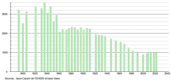 L'évolution du nombre d'habitants est connue à travers les recensements de la population effectués dans la commune depuis 1793. Pour les communes de moins de 10 000 habitants, une enquête de recensement portant sur toute la population est réalisée tous les cinq ans, les populations légales des années intermédiaires étant quant à elles estimées par interpolation ou extrapolation[27]. Pour la commune, le premier recensement exhaustif entrant dans le cadre du nouveau dispositif a été réalisé en 2007[28].