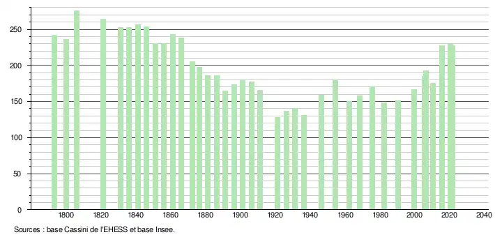 L'évolution du nombre d'habitants est connue à travers les recensements de la population effectués dans la commune depuis 1793. Pour les communes de moins de 10 000 habitants, une enquête de recensement portant sur toute la population est réalisée tous les cinq ans, les populations légales des années intermédiaires étant quant à elles estimées par interpolation ou extrapolation[18]. Pour la commune, le premier recensement exhaustif entrant dans le cadre du nouveau dispositif a été réalisé en 2005[19].