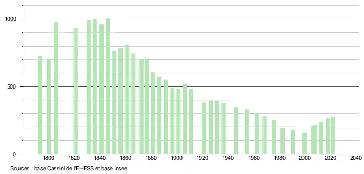 L'évolution du nombre d'habitants est connue à travers les recensements de la population effectués dans la commune depuis 1793. Pour les communes de moins de 10 000 habitants, une enquête de recensement portant sur toute la population est réalisée tous les cinq ans, les populations légales des années intermédiaires étant quant à elles estimées par interpolation ou extrapolation[15]. Pour la commune, le premier recensement exhaustif entrant dans le cadre du nouveau dispositif a été réalisé en 2007[16].