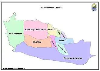 Le district de Moqattam se situe dans la zone sud du Caire, en Égypte. En 2017, elle comptait 224 138 habitants répartis dans ses dix chikhas[10] :