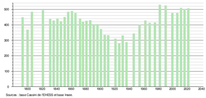 L'évolution du nombre d'habitants est connue à travers les recensements de la population effectués dans la commune depuis 1793. Pour les communes de moins de 10 000 habitants, une enquête de recensement portant sur toute la population est réalisée tous les cinq ans, les populations légales des années intermédiaires étant quant à elles estimées par interpolation ou extrapolation[15]. Pour la commune, le premier recensement exhaustif entrant dans le cadre du nouveau dispositif a été réalisé en 2006[16].