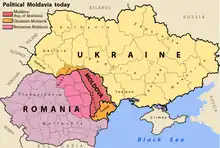 - la Moldavie occidentale, territoire résiduel de la principauté de Moldavie après les annexions autrichienne de 1775 et russe de 1812, qui a formé la Roumanie en fusionnant en 1859 avec la principauté de Valachie ;