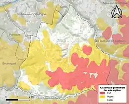 Les mouvements de terrains susceptibles de se produire sur la commune sont des tassements différentiels[36]. Le retrait-gonflement des sols argileux est susceptible d'engendrer des dommages importants aux bâtiments en cas d’alternance de périodes de sécheresse et de pluie[37]. 64,6 % de la superficie communale est en aléa moyen ou fort (58,6 % au niveau départemental et 48,5 % au niveau national métropolitain)[Carte 4]. Depuis le , en application de la loi ÉLAN, différentes contraintes s'imposent aux vendeurs, maîtres d'ouvrages ou constructeurs de biens situés dans une zone classée en aléa moyen ou fort[Note 4],[38].