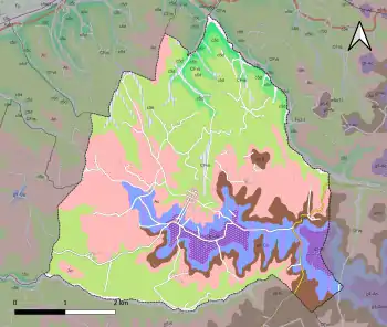 L'occupation des sols de la commune, telle qu'elle ressort de la base de données européenne d’occupation biophysique des sols Corine Land Cover (CLC), est marquée par l'importance des forêts et milieux semi-naturels (54,1 % en 2018), en augmentation par rapport à 1990 (52 %). La répartition détaillée en 2018 est la suivante : forêts (54,1 %), zones agricoles hétérogènes (22,9 %), prairies (16 %), terres arables (7 %)[30]. L'évolution de l’occupation des sols de la commune et de ses infrastructures peut être observée sur les différentes représentations cartographiques du territoire : la carte de Cassini (XVIIIe siècle), la carte d'état-major (1820-1866) et les cartes ou photos aériennes de l'IGN pour la période actuelle (1950 à aujourd'hui)[Carte 3].