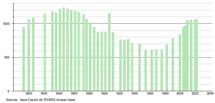 L'évolution du nombre d'habitants est connue à travers les recensements de la population effectués dans la commune depuis 1793. Pour les communes de moins de 10 000 habitants, une enquête de recensement portant sur toute la population est réalisée tous les cinq ans, les populations légales des années intermédiaires étant quant à elles estimées par interpolation ou extrapolation[21]. Pour la commune, le premier recensement exhaustif entrant dans le cadre du nouveau dispositif a été réalisé en 2004[22].