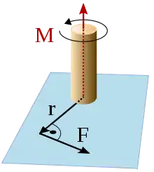 Par convention, la représentation du moment sera un vecteur porté par l'axe de rotation, de norme M = r · F · sin θ, et dont le sens est donné par la règle de la main droite. Cette construction est, par définition, le produit vectoriel des deux vecteurs et :