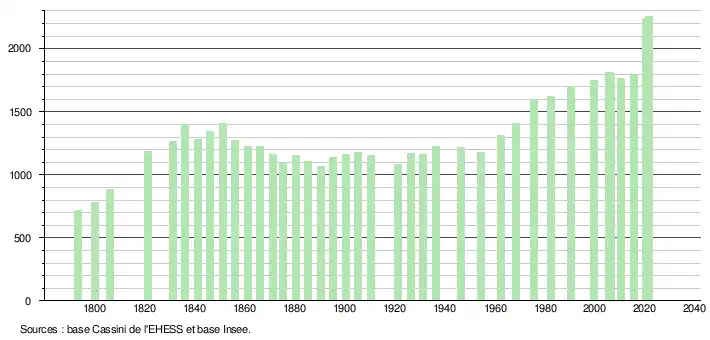 L'évolution du nombre d'habitants est connue à travers les recensements de la population effectués dans la commune depuis 1793. Pour les communes de moins de 10 000 habitants, une enquête de recensement portant sur toute la population est réalisée tous les cinq ans, les populations légales des années intermédiaires étant quant à elles estimées par interpolation ou extrapolation[27]. Pour la commune, le premier recensement exhaustif entrant dans le cadre du nouveau dispositif a été réalisé en 2005[28].