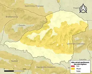 Le retrait-gonflement des sols argileux est susceptible d'engendrer des dommages importants aux bâtiments en cas d’alternance de périodes de sécheresse et de pluie. 52 % de la superficie communale est en aléa moyen ou fort (19,2 % au niveau départemental et 48,5 % au niveau national). Sur les 230 bâtiments dénombrés sur la commune en 2019, 177 sont en aléa moyen ou fort, soit 77 %, à comparer aux 17 % au niveau départemental et 54 % au niveau national. Une cartographie de l'exposition du territoire national au retrait gonflement des sols argileux est disponible sur le site du BRGM[19],[Carte 2].