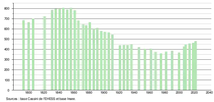 L'évolution du nombre d'habitants est connue à travers les recensements de la population effectués dans la commune depuis 1793. Pour les communes de moins de 10 000 habitants, une enquête de recensement portant sur toute la population est réalisée tous les cinq ans, les populations légales des années intermédiaires étant quant à elles estimées par interpolation ou extrapolation[22]. Pour la commune, le premier recensement exhaustif entrant dans le cadre du nouveau dispositif a été réalisé en 2008[23].