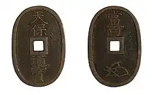 La monnaie de bronze valant 100 mon possédait une forme elliptique et pesait un peu plus de 20 g ; les plus courantes furent frappées sous l'ère Tenpō (1830-1844).