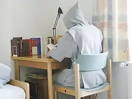 - À rebours du silence requis, le réfectoire est un lieu de convivialité (bavardages intempestifs, murmures médisants, ragots et rires), d'où le recours à un lecteur (moine désigné à tour de rôle dans le semainier) qui psalmodie recto tono des textes pieux et édifiants dans une chaire, encourageant ainsi le silence et la méditation[27].