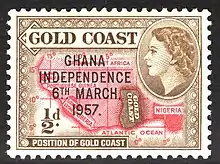 Le Ghana est le premier pays d'Afrique occidentale à obtenir son indépendance[1]. La loi sur l'indépendance du Ghana votée par le Parlement du Royaume-Uni en 1957 transforme la colonie britannique de la Côte-de-l'Or en État souverain et indépendant sous le nom de « dominion du Ghana », le , avec la reine Élisabeth II comme chef d'État[2]. La princesse Marina, duchesse de Kent, représente la reine aux célébrations de l'indépendance. Le , la princesse ouvre officiellement le premier Parlement du Ghana indépendant, au nom de la reine, en prononçant le discours du Trône[3].