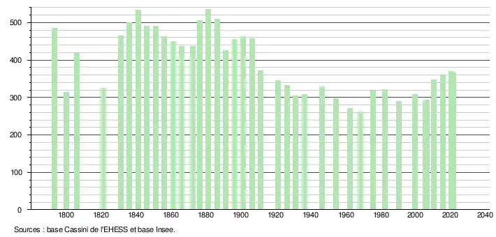 L'évolution du nombre d'habitants est connue à travers les recensements de la population effectués dans la commune depuis 1793. Pour les communes de moins de 10 000 habitants, une enquête de recensement portant sur toute la population est réalisée tous les cinq ans, les populations légales des années intermédiaires étant quant à elles estimées par interpolation ou extrapolation[41]. Pour la commune, le premier recensement exhaustif entrant dans le cadre du nouveau dispositif a été réalisé en 2005[42].