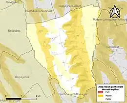 Le retrait-gonflement des sols argileux est susceptible d'engendrer des dommages importants aux bâtiments en cas d’alternance de périodes de sécheresse et de pluie[29]. 44,9 % de la superficie communale est en aléa moyen ou fort (59 % au niveau départemental et 48,5 % au niveau national)[Carte 3]. Depuis le , en application de la loi ELAN, différentes contraintes s'imposent aux vendeurs, maîtres d'ouvrages ou constructeurs de biens situés dans une zone classée en aléa moyen ou fort[Note 5],[30].