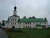 - L'église-catholicon de la Trinité est construite en 1589 avec la permission du tzar Fiodor Ier du 8 novembre 1587. Elle est terminée en 1606 et consacrée l'année suivante[8]. La construction est effectuée par des maçons et tailleurs de pierre de Vologda[8]. Elle est construite dans le style architectural de Novgorod avec des apports moscovites (liens d'arcature dans les murs du mur ouest, large entablement sous le zakomar)[9].
