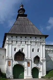 Au nord du monastère la cour de réception du monastère est fermée par un campanile de forme étonnante. L'édifice est formé de deux tours latérales et d'une grande tour centrale. Le toit est en forme de tente pyramidale. Sur la tour centrale se trouve une horloge et au dessus de celle-ci une petite tour avec couverture pyramidale elle-aussi. L'ensemble forme un tout insolite. À l'est de ce campanile se trouve l'église de la Transfiguration. Elle est surmontée d'un dôme de couleur verte. Cette église date de la même époque que les autres bâtiments c'est-à-dire 1650. Mais elle a été remaniée en 1690 dans l'esprit du baroque Narychkine[9].