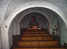 Depuis les travaux de restauration entrepris entre 1957 et 1960, on peut à nouveau admirer les fresques et tableaux gothiques du dernier quart du XVe siècle. Les mastics colorés gris-blancs soulignés de blocs rouges et l'ornementation de la clé de voûte sont encore plus anciens. Les rinceaux de la voûte, deux anges et d'autres éléments remontent à 1499. La fresque de saint Christophe, redécouverte en 1933, date du début du XVIe siècle[66].