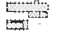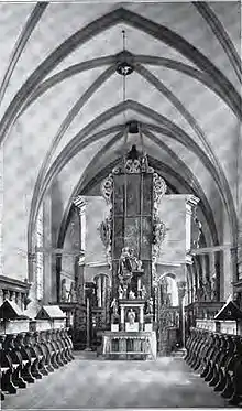 L'église gothique que l'on visite aujourd'hui est du XIVe siècle. C'est une église à nef unique en neuf croisées et un chœur-5/8[63]. La nef a été construite en trois phases. Le chœur et la nef sont voûtées par croisées d'ogive.