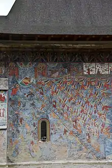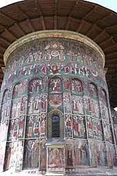 Les peintures extérieures du monastère sont les mieux conservées de toutes celles de Moldavie et les seules où l'on peut admirer sur la façade nord l'Échelle sainte, composition impressionnante par sa taille et par l'ordre régnant parmi les anges et le chaos de l'enfer. Cette scène symbolise le combat entre le bien et le mal, l'aspiration de l'homme vers la perfection.