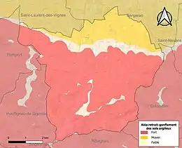 Les mouvements de terrains susceptibles de se produire sur la commune sont des tassements différentiels[38]. Le retrait-gonflement des sols argileux est susceptible d'engendrer des dommages importants aux bâtiments en cas d’alternance de périodes de sécheresse et de pluie[39]. 90,8 % de la superficie communale est en aléa moyen ou fort (58,6 % au niveau départemental et 48,5 % au niveau national métropolitain)[Carte 4]. Depuis le , en application de la loi ÉLAN, différentes contraintes s'imposent aux vendeurs, maîtres d'ouvrages ou constructeurs de biens situés dans une zone classée en aléa moyen ou fort[Note 5],[40].