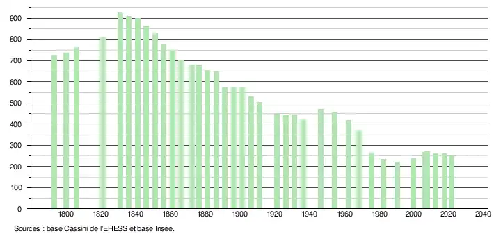 L'évolution du nombre d'habitants est connue à travers les recensements de la population effectués dans la commune depuis 1793. Pour les communes de moins de 10 000 habitants, une enquête de recensement portant sur toute la population est réalisée tous les cinq ans, les populations légales des années intermédiaires étant quant à elles estimées par interpolation ou extrapolation[18]. Pour la commune, le premier recensement exhaustif entrant dans le cadre du nouveau dispositif a été réalisé en 2007[19].