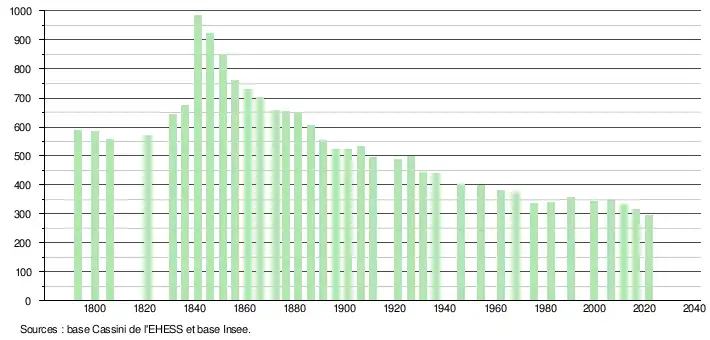 L'évolution du nombre d'habitants est connue à travers les recensements de la population effectués dans la commune depuis 1793. Pour les communes de moins de 10 000 habitants, une enquête de recensement portant sur toute la population est réalisée tous les cinq ans, les populations légales des années intermédiaires étant quant à elles estimées par interpolation ou extrapolation[50]. Pour la commune, le premier recensement exhaustif entrant dans le cadre du nouveau dispositif a été réalisé en 2006[51].