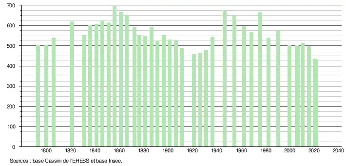 L'évolution du nombre d'habitants est connue à travers les recensements de la population effectués dans la commune depuis 1793. Pour les communes de moins de 10 000 habitants, une enquête de recensement portant sur toute la population est réalisée tous les cinq ans, les populations légales des années intermédiaires étant quant à elles estimées par interpolation ou extrapolation[18]. Pour la commune, le premier recensement exhaustif entrant dans le cadre du nouveau dispositif a été réalisé en 2005[19].