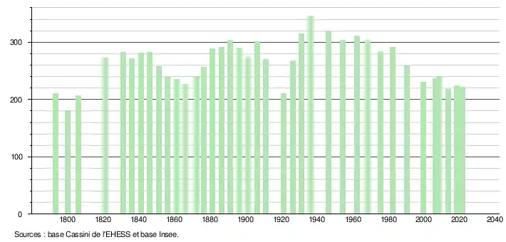 L'évolution du nombre d'habitants est connue à travers les recensements de la population effectués dans la commune depuis 1793. Pour les communes de moins de 10 000 habitants, une enquête de recensement portant sur toute la population est réalisée tous les cinq ans, les populations légales des années intermédiaires étant quant à elles estimées par interpolation ou extrapolation[24]. Pour la commune, le premier recensement exhaustif entrant dans le cadre du nouveau dispositif a été réalisé en 2008[25].