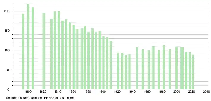 L'évolution du nombre d'habitants est connue à travers les recensements de la population effectués dans la commune depuis 1793. Pour les communes de moins de 10 000 habitants, une enquête de recensement portant sur toute la population est réalisée tous les cinq ans, les populations légales des années intermédiaires étant quant à elles estimées par interpolation ou extrapolation[20]. Pour la commune, le premier recensement exhaustif entrant dans le cadre du nouveau dispositif a été réalisé en 2007[21].