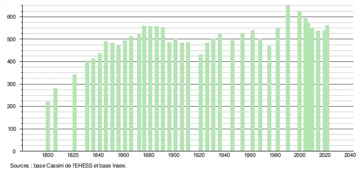 L'évolution du nombre d'habitants est connue à travers les recensements de la population effectués dans la commune depuis 1800. Pour les communes de moins de 10 000 habitants, une enquête de recensement portant sur toute la population est réalisée tous les cinq ans, les populations légales des années intermédiaires étant quant à elles estimées par interpolation ou extrapolation[18]. Pour la commune, le premier recensement exhaustif entrant dans le cadre du nouveau dispositif a été réalisé en 2004[19].