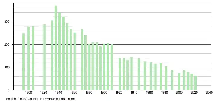 L'évolution du nombre d'habitants est connue à travers les recensements de la population effectués dans la commune depuis 1793. Pour les communes de moins de 10 000 habitants, une enquête de recensement portant sur toute la population est réalisée tous les cinq ans, les populations légales des années intermédiaires étant quant à elles estimées par interpolation ou extrapolation[16]. Pour la commune, le premier recensement exhaustif entrant dans le cadre du nouveau dispositif a été réalisé en 2006[17].