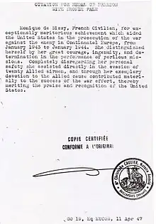 Médaille de la Liberté avec palme de Bronze (États-Unis) en 1947