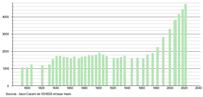 L'évolution du nombre d'habitants est connue à travers les recensements de la population effectués dans la commune depuis 1793. Pour les communes de moins de 10 000 habitants, une enquête de recensement portant sur toute la population est réalisée tous les cinq ans, les populations légales des années intermédiaires étant quant à elles estimées par interpolation ou extrapolation[34]. Pour la commune, le premier recensement exhaustif entrant dans le cadre du nouveau dispositif a été réalisé en 2007[35].