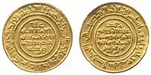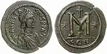 La monnaie byzantine, utilisée dans l’Empire romain d’Orient après la chute de Rome en 476, reposait sur deux types de pièces : le solidus (pl. solidi) d’or qui sera appelé nomisma (pl. nomismata)[N 1] lorsque le grec remplaça le latin comme langue d’administration, et diverses pièces de bronze. Les pièces d’argent, absentes au début de l’empire en raison de la difficulté de fixer leur parité avec l’or, ne firent leur apparition que vers la fin de l’empire.