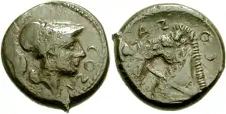 - Les monnaies du type Mars présentent sur le droit la tête de la divinité barbue et casquée et sur le revers une tête de cheval avec harnais positionné sur un dauphin nageur.