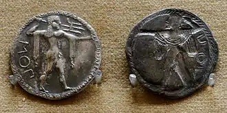 À Athènes, les premières monnaies athéniennes sont probablement frappées sous Pisistrate et ses fils, à la fin du VIe siècle av. J.-C.[16] Elles se décomposent en deux séries distinctes reposant sur un même étalon où la drachme de 4,3 g est, comme à Égine, divisée en six oboles – Athènes conservera cet étalon jusqu'au Ier siècle av. J.-C.[17]. La première recouvre des drachmes et didrachmes à types divers : amphore, chouette, tête de Gorgone, etc. On parle traditionnellement de Wappenmünzen ou « pièces à blason » : la première interprétation, abandonnée depuis, voyait dans ces types les blasons des grandes familles athéniennes[17]. Vers la fin de cette série apparaissent des monnaies de poids double, les tétradrachmes, portant au droit une tête de félin, sans doute de panthère. Un peu après, à une date qui reste sujette à débat, Athènes adopte son célèbre type portant une tête d'Athéna casquée, protectrice de la cité, au droit et la célèbre chouette (d'où leur surnom traditionnel de « chouettes »), emblème de la déesse, au revers, entourée du rameau d’olivier et des lettres ΑΘΕ. Produites en abondance, ces monnaies sont réalisées en argent extrait des mines du Laurion[18].