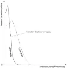 Différence de l'isotherme de compression entre un lipide fluide (en pointillés) et un lipide rigide. Le lipide rigide montre une transition de phase principale contrairement au lipide fluide.