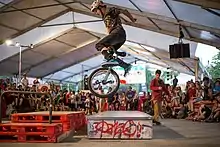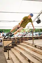 - Au même moment, l'Américain Jacob Spera est le premier à slider une rampe d'escalier en la remontant[67]. À noter qu'il roule en 24 pouces.