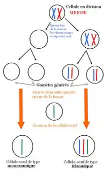 Les chromosomes sont mal séparés lors de la méiose I. De ce fait, deux cellules sur quatre manquent de certains chromosomes. Par la suite, après la fécondation, seul le gamète venant du partenaire apportera de l'information génétique. Par conséquent, une des paires de chromosomes du descendant ne sera pas complétée. Une monosomie peut intervenir sur n'importe quelle paire de chromosomes.