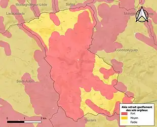Le retrait-gonflement des sols argileux est susceptible d'engendrer des dommages importants aux bâtiments en cas d’alternance de périodes de sécheresse et de pluie[18]. La totalité de la commune est en aléa moyen ou fort (91,8 % au niveau départemental et 48,5 % au niveau national)[Carte 2]. Depuis le , en application de la loi ELAN, différentes contraintes s'imposent aux vendeurs, maîtres d'ouvrages ou constructeurs de biens situés dans une zone classée en aléa moyen ou fort[Note 3],[19].