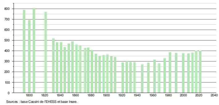 | L'évolution du nombre d'habitants est connue à travers les recensements de la population effectués dans la commune depuis 1793. Pour les communes de moins de 10 000 habitants, une enquête de recensement portant sur toute la population est réalisée tous les cinq ans, les populations légales des années intermédiaires étant quant à elles estimées par interpolation ou extrapolation[20]. Pour la commune, le premier recensement exhaustif entrant dans le cadre du nouveau dispositif a été réalisé en 2006[21]. En 2021, la commune comptait 401 habitants[Note 4], en augmentation de 0,75 % par rapport à 2015 (Lot-et-Garonne : −0,66 %, France hors Mayotte : +1,84 %). |