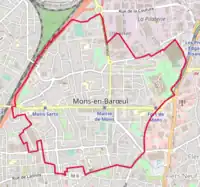 Très longtemps pays uniquement rural, des plans[19] du XVIIIe siècle montrent Mons-en-Barœul comme un petit village sans église avec des censes éparses le long du grand chemin de Lille à Roubaix. Elle est ancienne dépendance de Fives. En 1844, Mons devint une paroisse à part entière, c'est à cette époque que l'Église Saint-Pierre est édifiée[20]. Après la seconde guerre mondiale, la ville connut de profonds changements avec, d'une part, l'édification du lotissement des Sarts entre 1954 et 1959[21], et d'autre part l'établissement d'une ZUP, aménagée sur 80 hectares du territoire communal, et dont les premiers immeubles virent le jour en 1965[22].