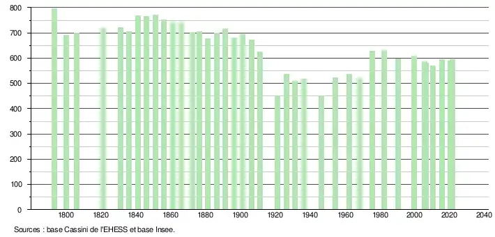 L'évolution du nombre d'habitants est connue à travers les recensements de la population effectués dans la commune depuis 1793. Pour les communes de moins de 10 000 habitants, une enquête de recensement portant sur toute la population est réalisée tous les cinq ans, les populations légales des années intermédiaires étant quant à elles estimées par interpolation ou extrapolation[29]. Pour la commune, le premier recensement exhaustif entrant dans le cadre du nouveau dispositif a été réalisé en 2005[30].