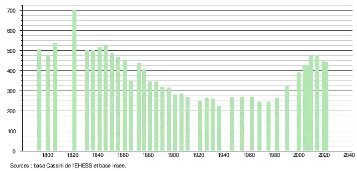 L'évolution du nombre d'habitants est connue à travers les recensements de la population effectués dans la commune depuis 1793. Pour les communes de moins de 10 000 habitants, une enquête de recensement portant sur toute la population est réalisée tous les cinq ans, les populations légales des années intermédiaires étant quant à elles estimées par interpolation ou extrapolation[49]. Pour la commune, le premier recensement exhaustif entrant dans le cadre du nouveau dispositif a été réalisé en 2004[50].