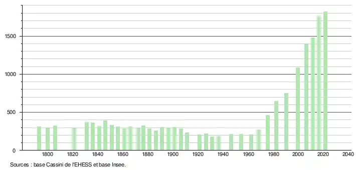 L'évolution du nombre d'habitants est connue à travers les recensements de la population effectués dans la commune depuis 1793. Pour les communes de moins de 10 000 habitants, une enquête de recensement portant sur toute la population est réalisée tous les cinq ans, les populations légales des années intermédiaires étant quant à elles estimées par interpolation ou extrapolation[29]. Pour la commune, le premier recensement exhaustif entrant dans le cadre du nouveau dispositif a été réalisé en 2006[30].